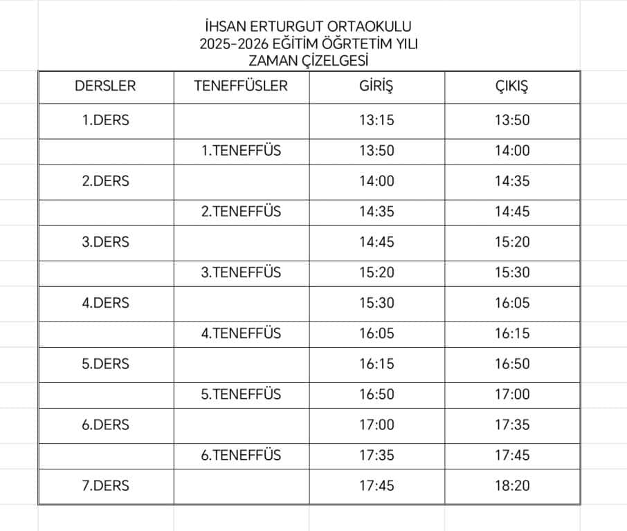2025-2026 EĞİTİM ÖĞRETİM YILI OKULUMUZUN ZAMAN ÇİZELGESİ